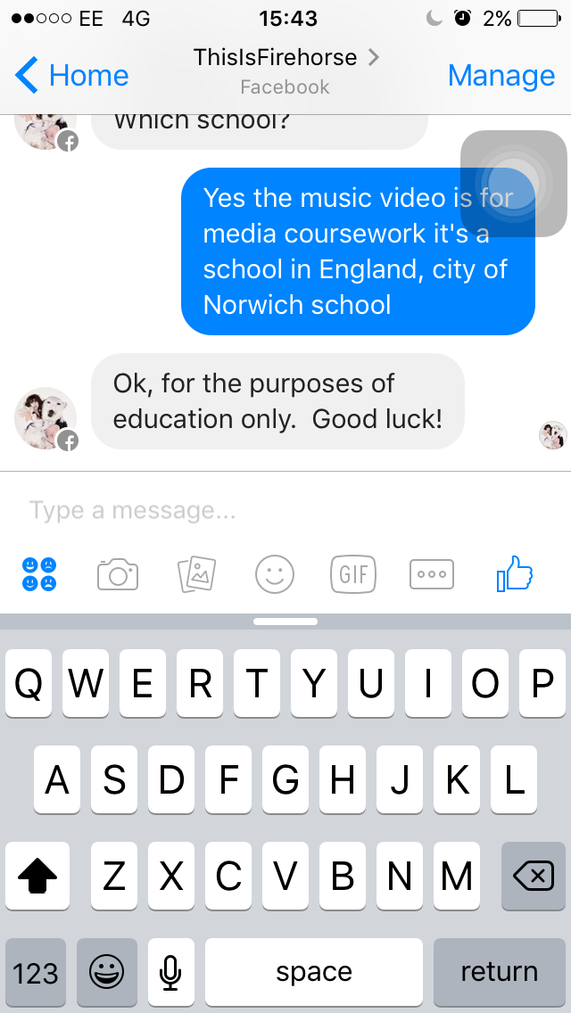 For our media product we didn't really have any song choices as we had heard a specific song played in our class. The song we chose to make a video to is Bloodstream by FireHorse in which she has enabled us to use by giving us permission. As we already had an idea of the video that we wanted to make from hearing the song in class, the search for a song was very limited as we were looking for something very specific which coincedentally happened to be Bloodstream by Firehorse. We were hesistant to pick this song as a group in a previous year had already used it and we didnt want ot have to worry about copying this song. We were also hesitant about picking the song incase it wasnt orignal enough as we didnt want to completely copy the other group a few years ago which was a worry.